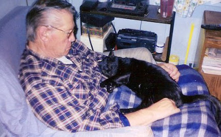 **I saved a small bit of the ashes. When Dad would be sitting in his recliner, our dear black cat Duncan (who left us in 2012) would look up hopefully at him and Dad would say, "Don't come up here, Old Cat" or some variation in which he expressed a desire for Duncan to stay down. A little time later, you'd look over and Duncan would be in Dad's lap, both of them quietly asleep. I mixed Dad's ashes with Duncan's and told Eli that now they can nap together like old times.